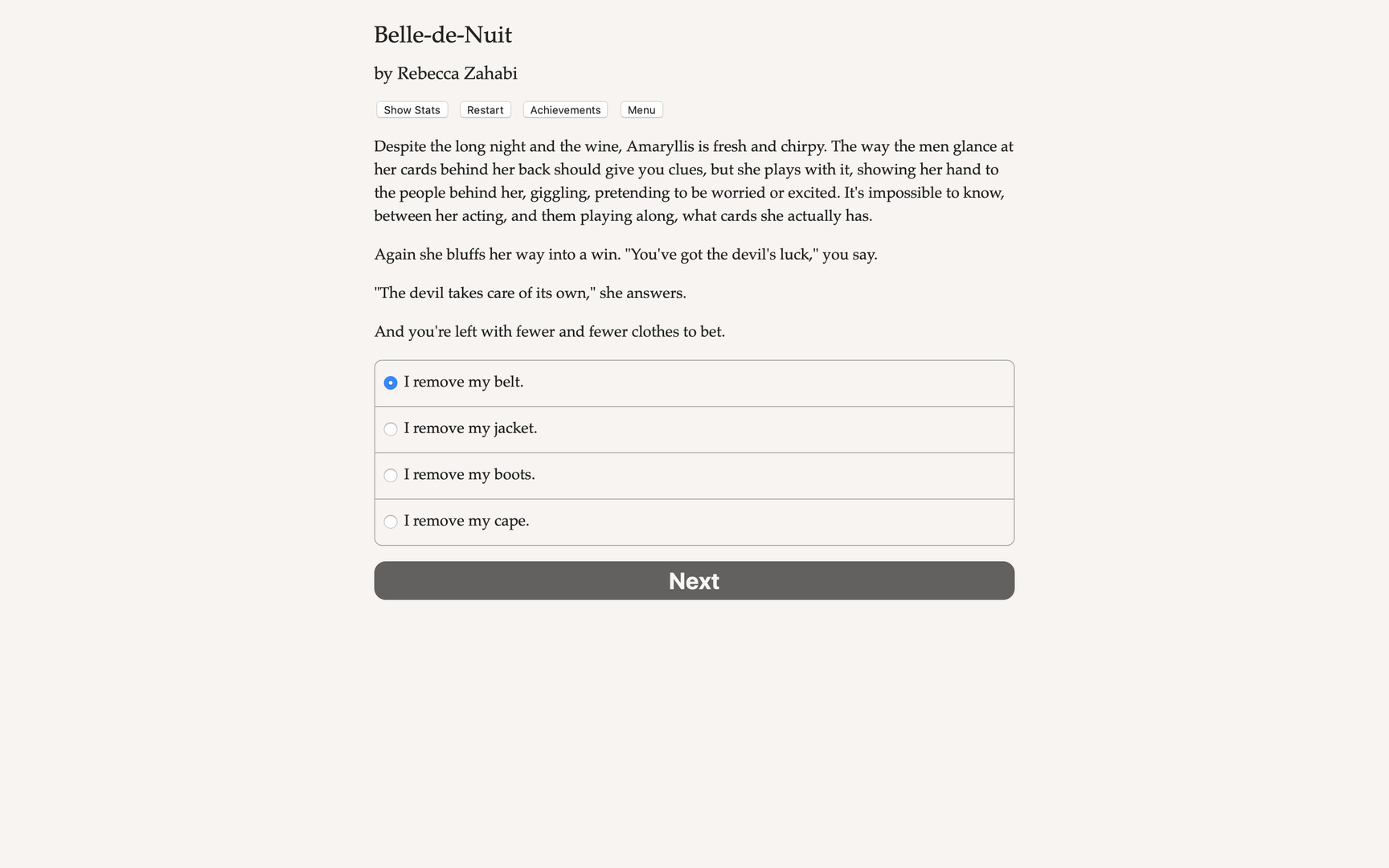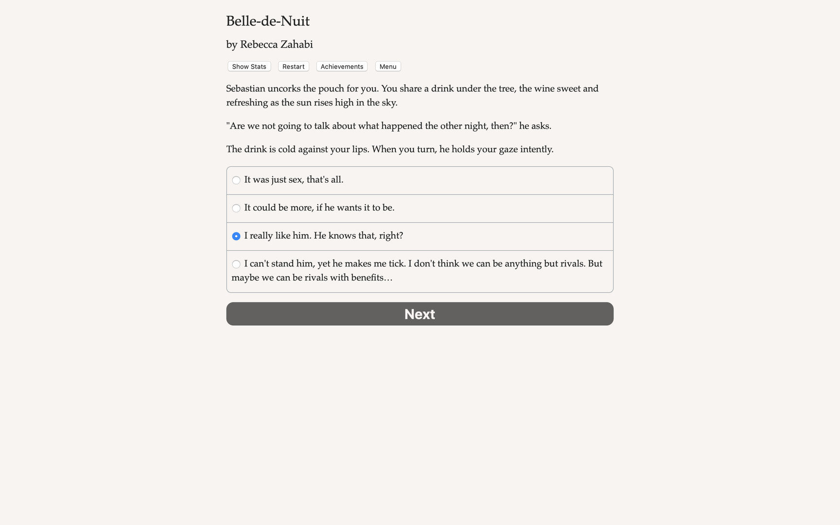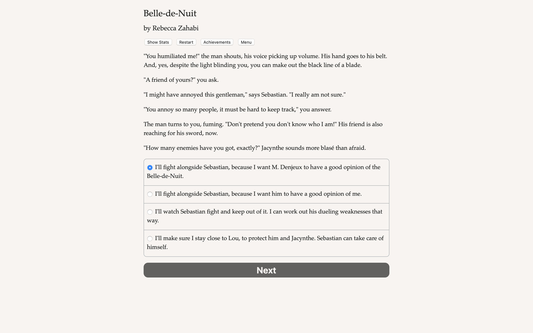 Win duels and hearts as a swordswoman at the Belle-de-Nuit, Paris’s finest luxury brothel! Fight for the honor of the ladies of the night in this game of swords and seductions. Belle-de-Nuit is a 115,000-word interactive romance novel by Rebecca Zahabi, author of Never Date Werewolves. It’s entirely text-based, without graphics or sound effects, and fueled by the vast, unstoppable power of your imagination. The Belle-de-Nuit is yours to protect, and yours to love. Some of the courtesans have been your best friends for years, and maybe you have a childhood sweetheart whom you’d like to steal from her customers… There is also the shy bartender, with a heavy secret and liquor-scented lips. They have arrived in Paris without telling anyone where they came from, why they travelled this far, or why they always seem so nostalgic. But Madame wants you to focus on securing the next big patron for the Belle-de-Nuit. Unfortunately, he has a duelist of his own, Sebastian–so frustratingly good at fencing, he threatens your reputation as the best duelist in Paris. You are burning to defeat him in a duel…but do you want to best him with the blade, or bed him? Madame’s house is filled with lovers. But which will be yours? Play as female, gay, straight or bi. Indulge in Parisian nightlife, where seduction and good wine, lies and kisses go hand in hand. Choose a sweetheart – or get involved with more than one – between a rival duelist, a lady of the night and the shy bartender who pours your drinks.