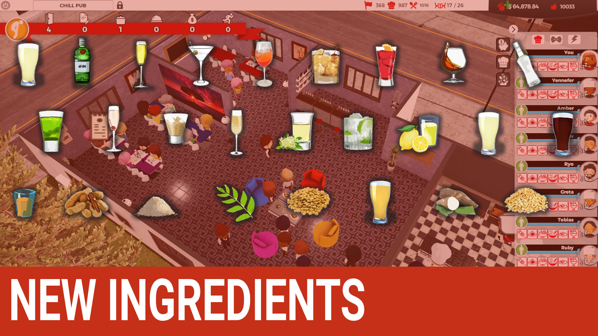 An entire new Skill Tree dedicated to beverages, bringing your menu quality to new peaks! 26 new pre-made Recipes, so you don’t have to ask your bartender for a list of ingredients if you want to copy existing cocktails! 26 tasty new ingredients to create unique beverages with! 40 new decorations to give your place a unique look, including flashy neons to lure people with high alcohol tolerance!