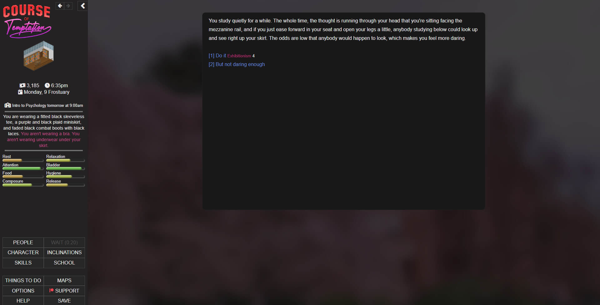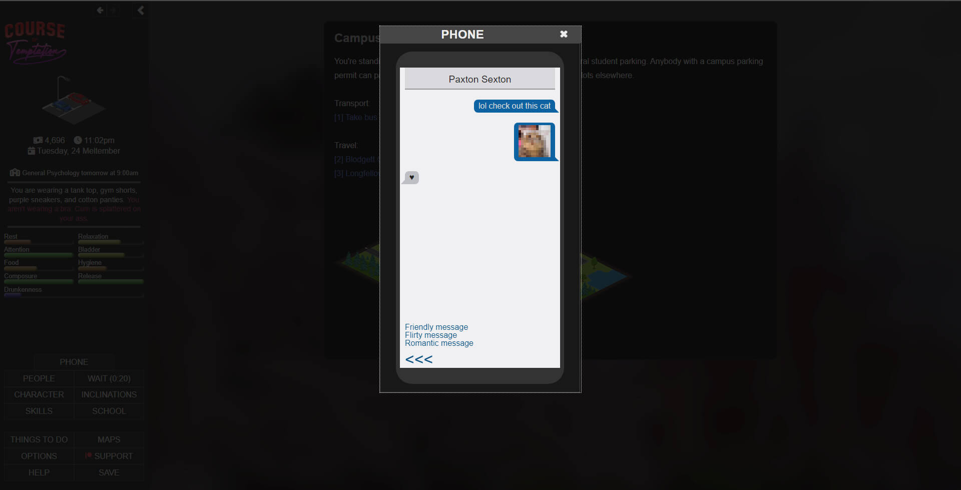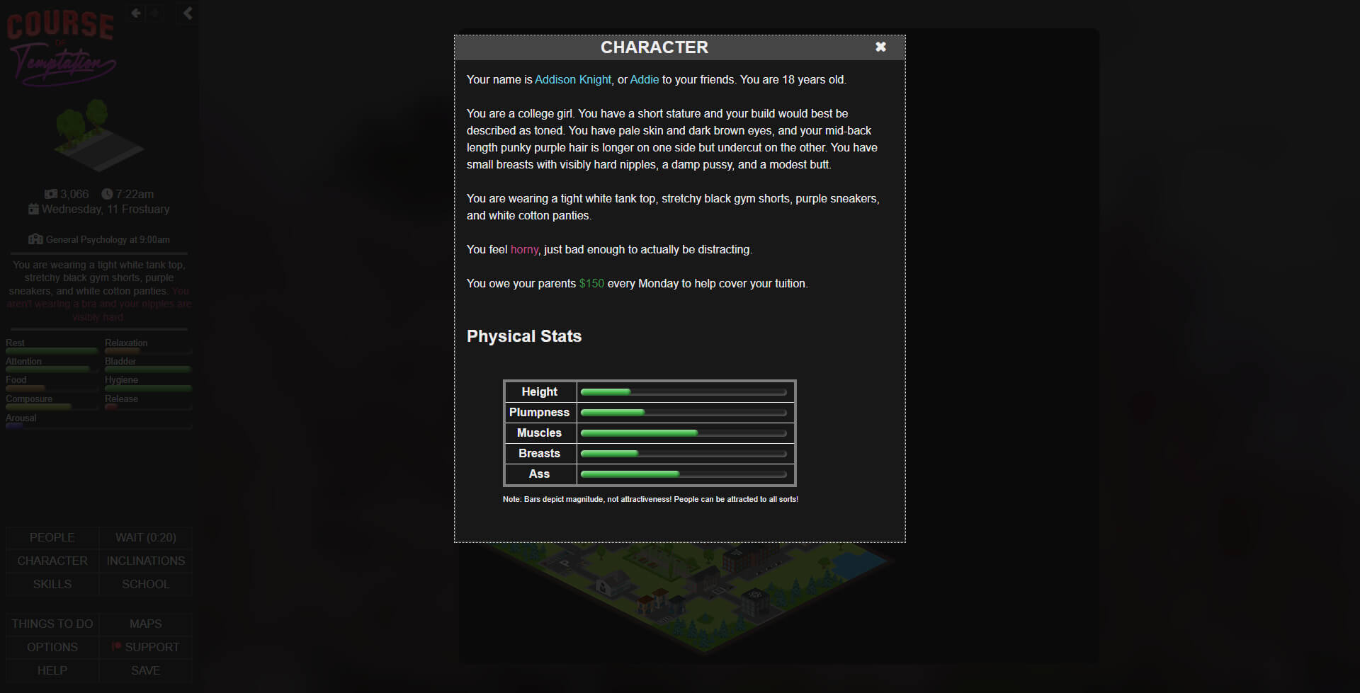 Course of Temptation Free Download Free Steam Games in direct link – PiratedGames.com – Course of Temptation is a detailed adult college life simulator. It’s text-based and runs right in your browser. Featuring a detailed simulation with hundreds of possible events and erotic scenes, you can explore your exhibitionist, voyeuristic, and debauched fantasies through your character. Play as male or female (with transgender options) or non-binary.