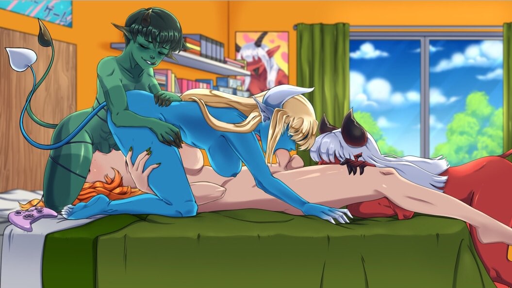 Demons Rise Up! is a kinetic futanari visual novel about a pro-gamer named Suzy who summons a succubus through a cursed video game created by developers from the pits of hell. After a night of lovemaking with her creation, the succubus decides to bring along some of her demon friends for some multiplayer action. There’s just one problem! After finding Suzy playing on her console, it’s now up to the three demons to push her away from her gaming session so that she can push them onto her bed! Can they do it? Read and find out.