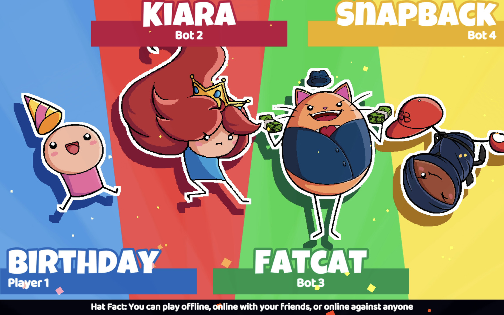 King of the Hat is 2-4 player 2D party platformer where you fight with a hat! Throw your hat to attack, defend and bait opponents. But watch out! If someone jumps on your hat… you die! In King of the Hat, your hat contains your soul. Crush your opponent’s hats (and souls) to assert your dominance over them. When you throw your hat, it goes on fire and becomes invulnerable. You can use it to beat the devil out of other players or to defend against your opponents’ flaming hats. Although the basic mechanics are easy to pick up and play, King of the Hat allows for deep, hat-tastic competitive play as a 2 player game. Change the rules, add power ups and play around level hazards to create the hat-based madness you’ve always dreamed of. One thing to note is in the games current state, you will need to join the discord server if you want to find any matches because there’s no in game matchmaking, although if the game succeeds this might change, and i will update my review. Casually or competitively, King of the Hat I’ve witnessed throughout the years has something to show everyone and I can’t recommend this game enough!