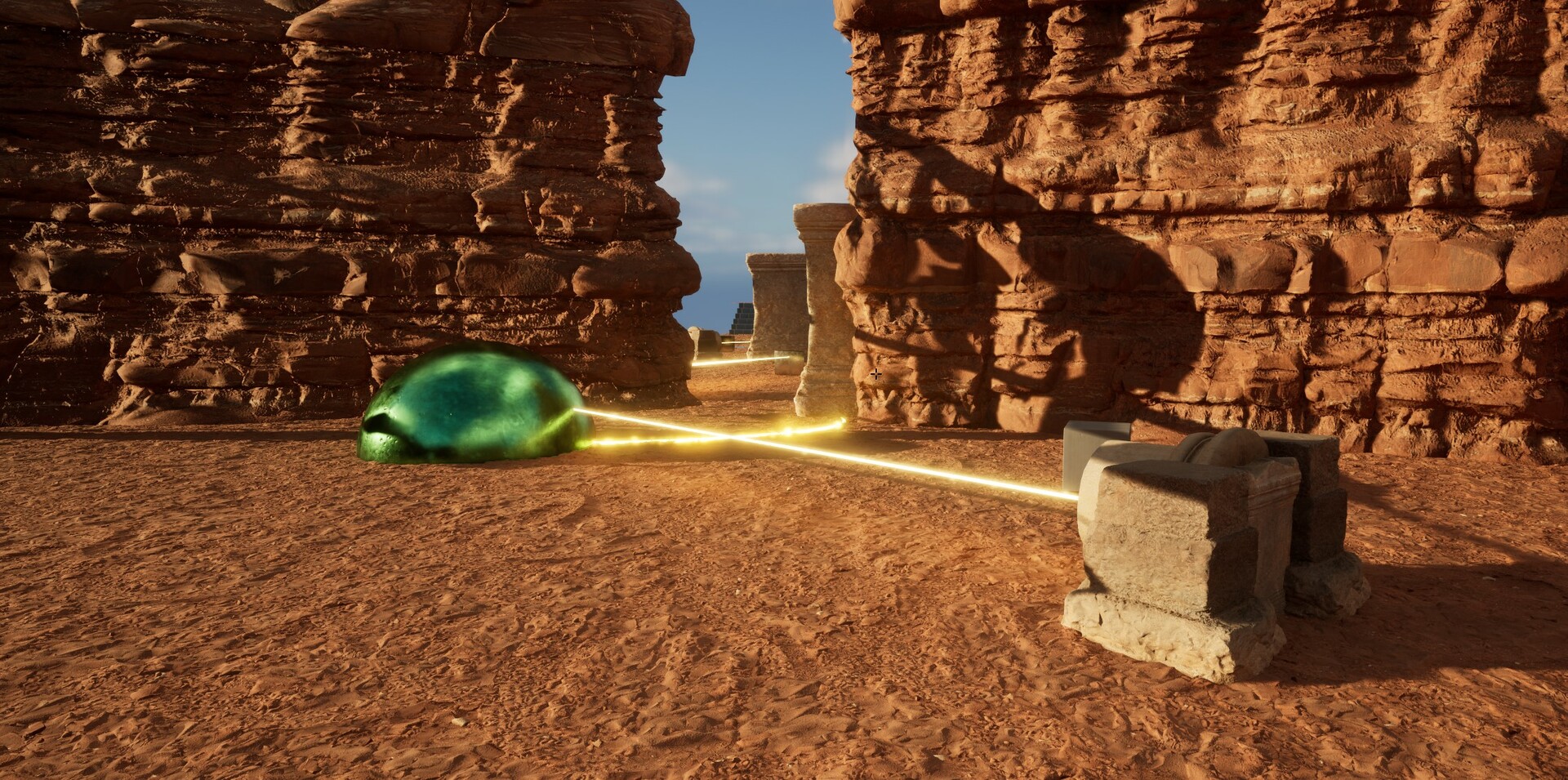 of this oasis marking the opening of the Sahara desert. Lasers, blocks, button to activate, physics to count on. All of this is awaiting you in the world of Maiz. To solve the puzzles you are going to have to use laser reflexions, button pushing with either