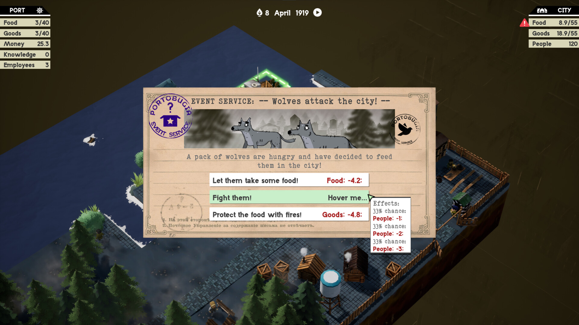 Portobugia is a management/survival game where you manage a port and must supply a city with goods and food. To do so you must unload boats, but, be careful, some of them could be infected! What happened? After the First World War, Eastern Europe has fallen into chaos… Bugs are eating all the crops, spreading diseases, and bandits are everywhere… There is no government to bring peace to the region which means cities must survive by themselves… Inspect boats! When a boat arrives in your port, you must inspect it before unloading or refusing it. You must verify the report by looking at the boat and comparing it to the report. If you correctly verify the report you will get some rewards. But if you don’t pay attention enough attention to the infection, you will have problems with bugs that will eat some of your resources! Manage your port! You start with a very basic port, but this port will not be enough to survive in this post-WWI world. You must quickly develop your infrastructure if you want to last(the city to survive). Construct new buildings, upgrade the ones you already have, or research new technologies! You can also hire employees to increase your building’s efficiency, but they will ask for a daily income. And don’t forget to send some resources to the city, otherwise your citizens will die!