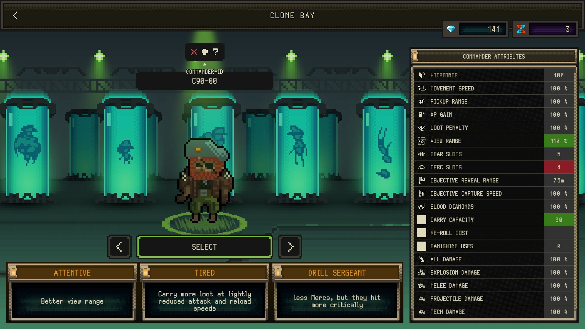 In a world threatened by an evil mega-corporation’s private robot army, the last bastion of hope for mankind is a bunch of armed lunatics who signed up for a mercenary job. And who better to lead them than a disposable clone with an unpredictable set of special traits? Welcome to your new assignment, Commander. Take the battle to the enemy and build your underfunded, over-ambitious outfit into an apocalyptic war machine that rids the world of evil. With all chances stacked against your mercenary operation, this isn’t about glory. This is about the loot! Every Commander is created from a set of randomly selected traits. Can you lead your squad to victory with a colorblind, megalomaniac Infiltrator? Or take on the enemy alone with a deaf, greedy One-Man Army? How about a nostalgic, vampiric Berserke Each combination of traits yields a unique run with its own set of challenges, mechanics, and surprising synergies.